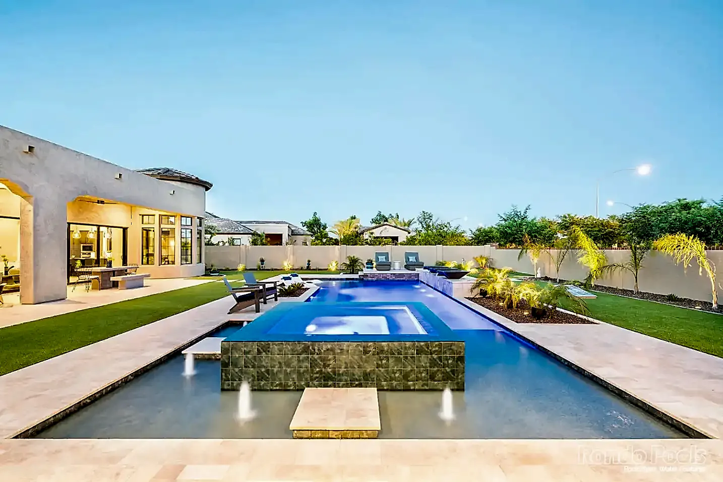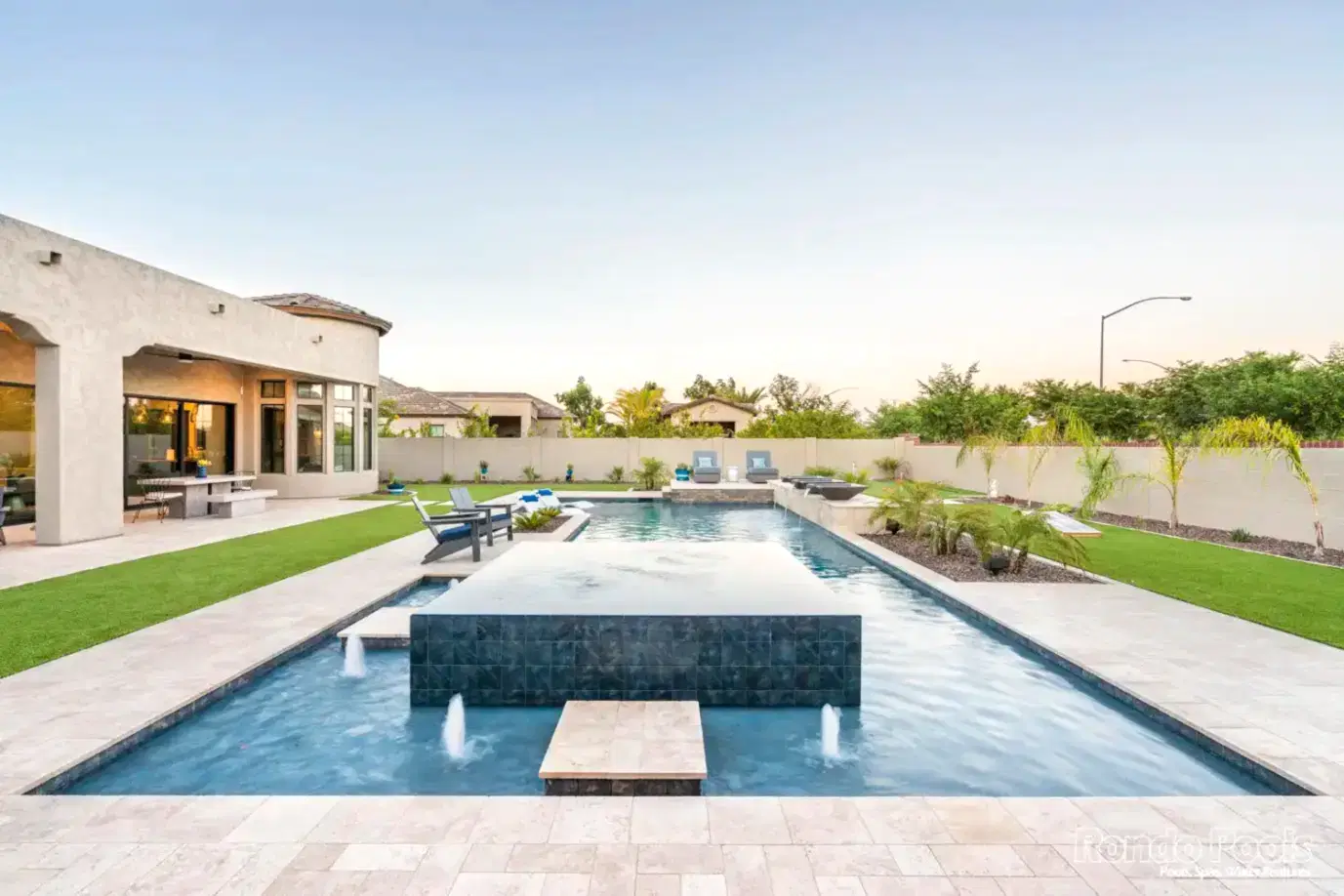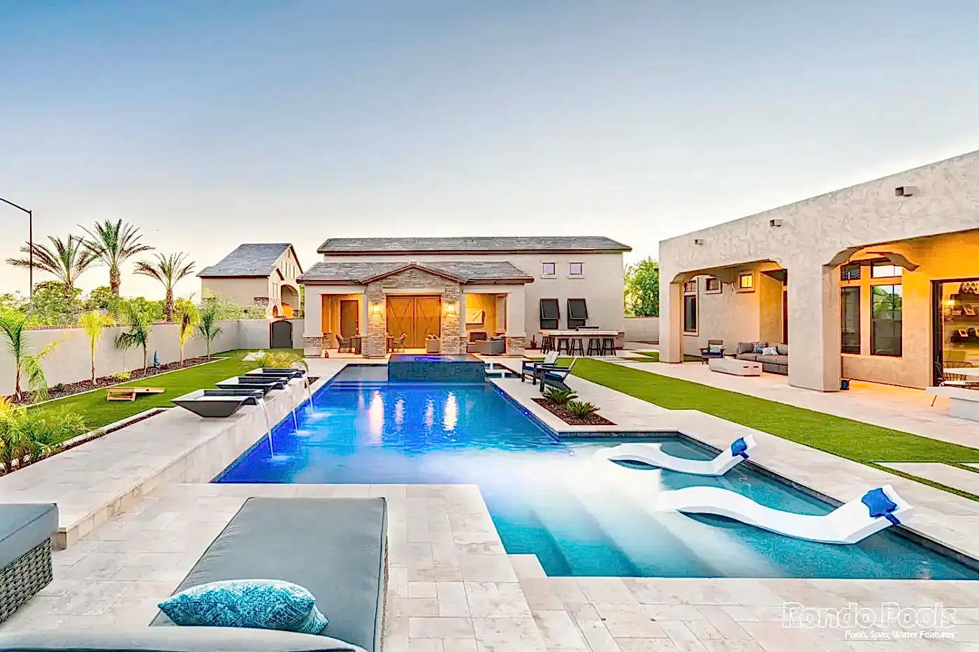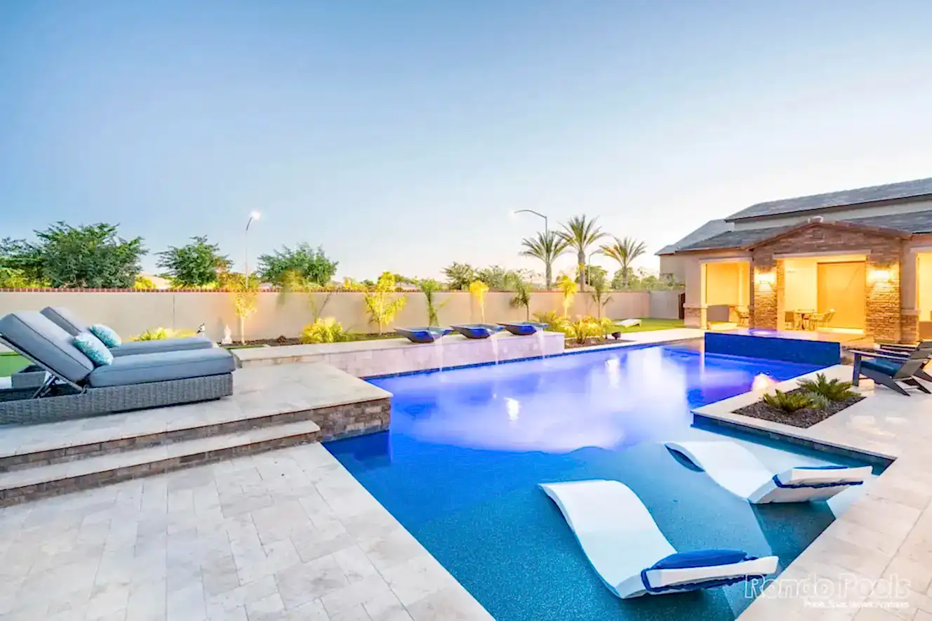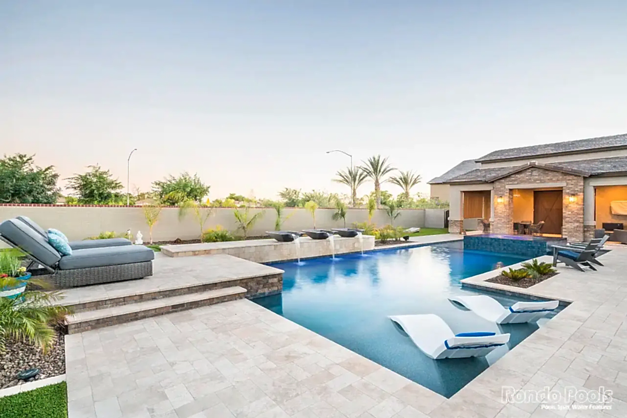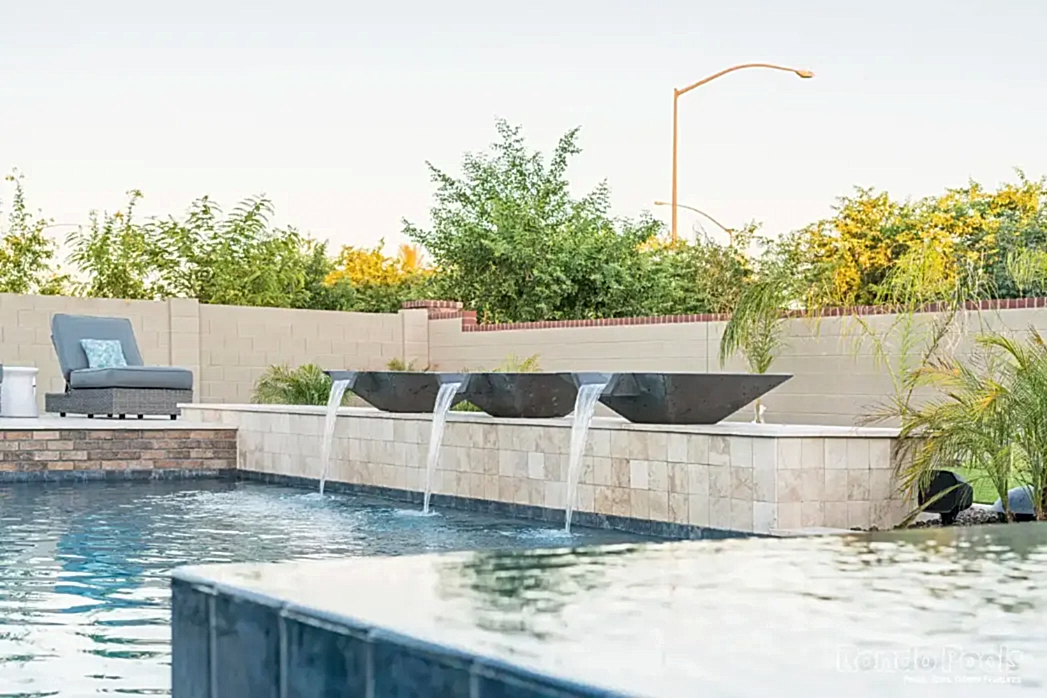 This backyard features a stunning modern pool with sleek water features spilling gracefully from elevated scuppers. The pool is surrounded by elegant travertine decking, complemented by built-in lounge chairs partially submerged in the shallow sun shelf for ultimate relaxation. The lush landscaping, including palms and vibrant greenery, enhances the serene atmosphere. Adjacent to the pool, a cozy seating area and a brick-accented outdoor living space make this backyard perfect for both entertaining and unwinding in style.