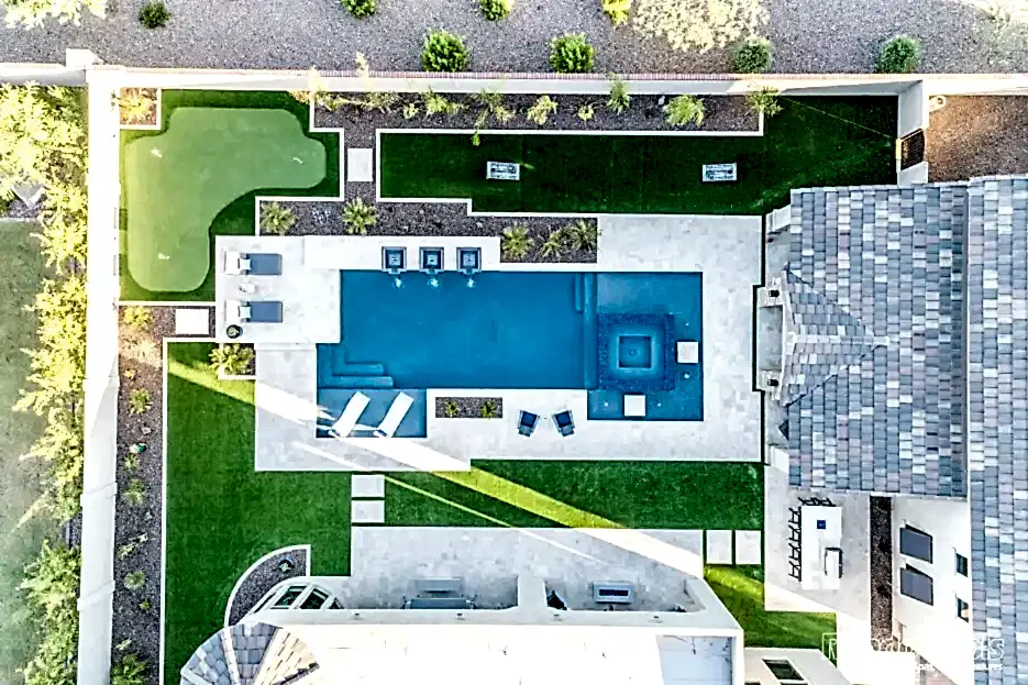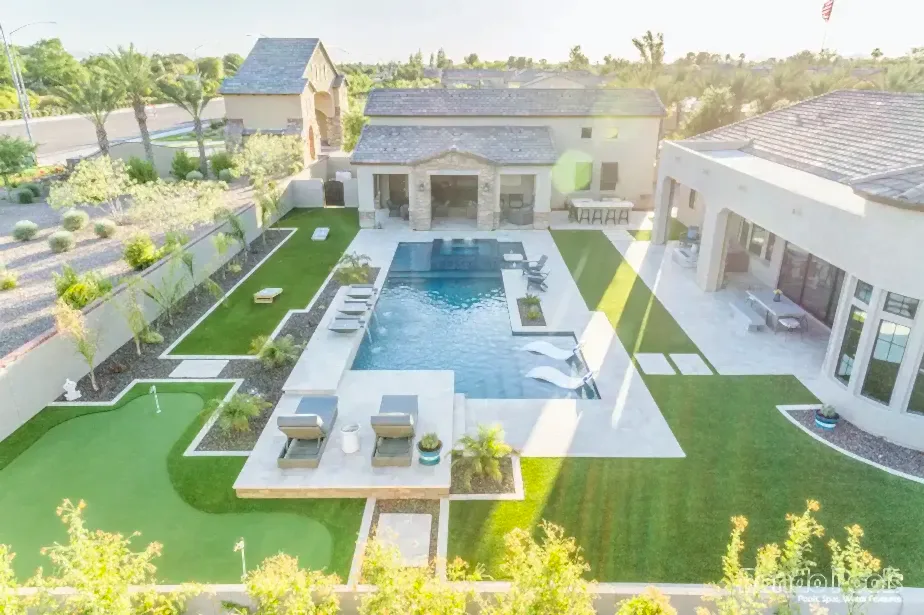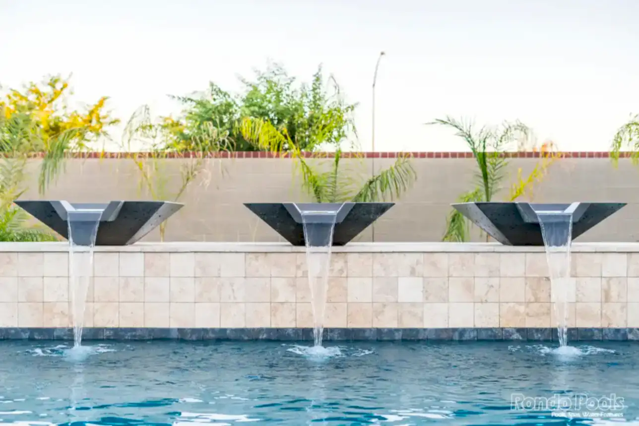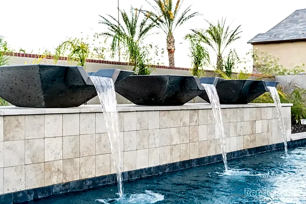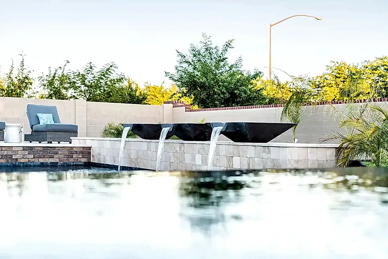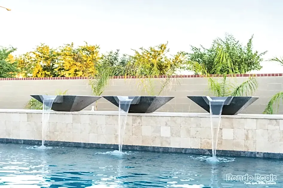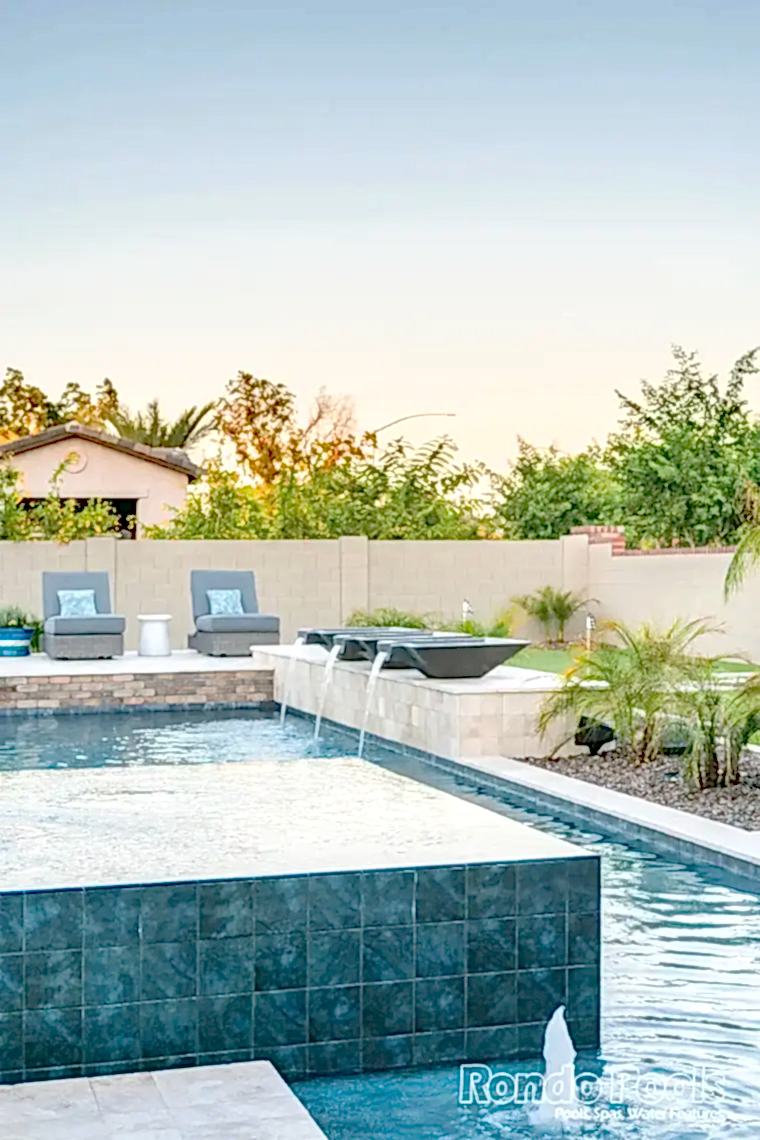 This backyard features a stunning modern pool with sleek water features spilling gracefully from elevated scuppers. The pool is surrounded by elegant travertine decking, complemented by built-in lounge chairs partially submerged in the shallow sun shelf for ultimate relaxation. The lush landscaping, including palms and vibrant greenery, enhances the serene atmosphere. Adjacent to the pool, a cozy seating area and a brick-accented outdoor living space make this backyard perfect for both entertaining and unwinding in style.