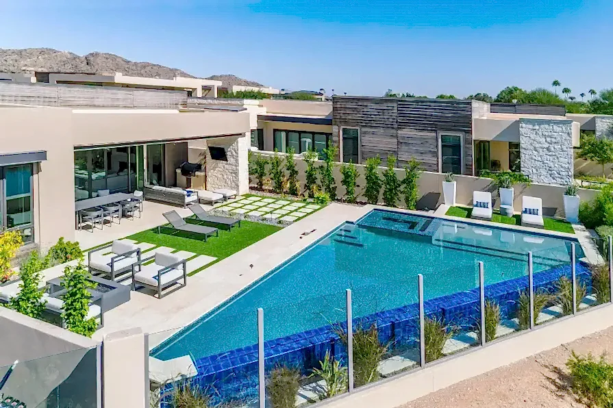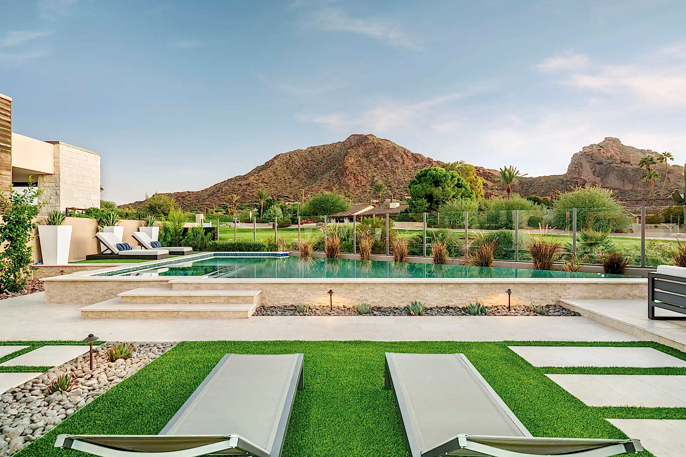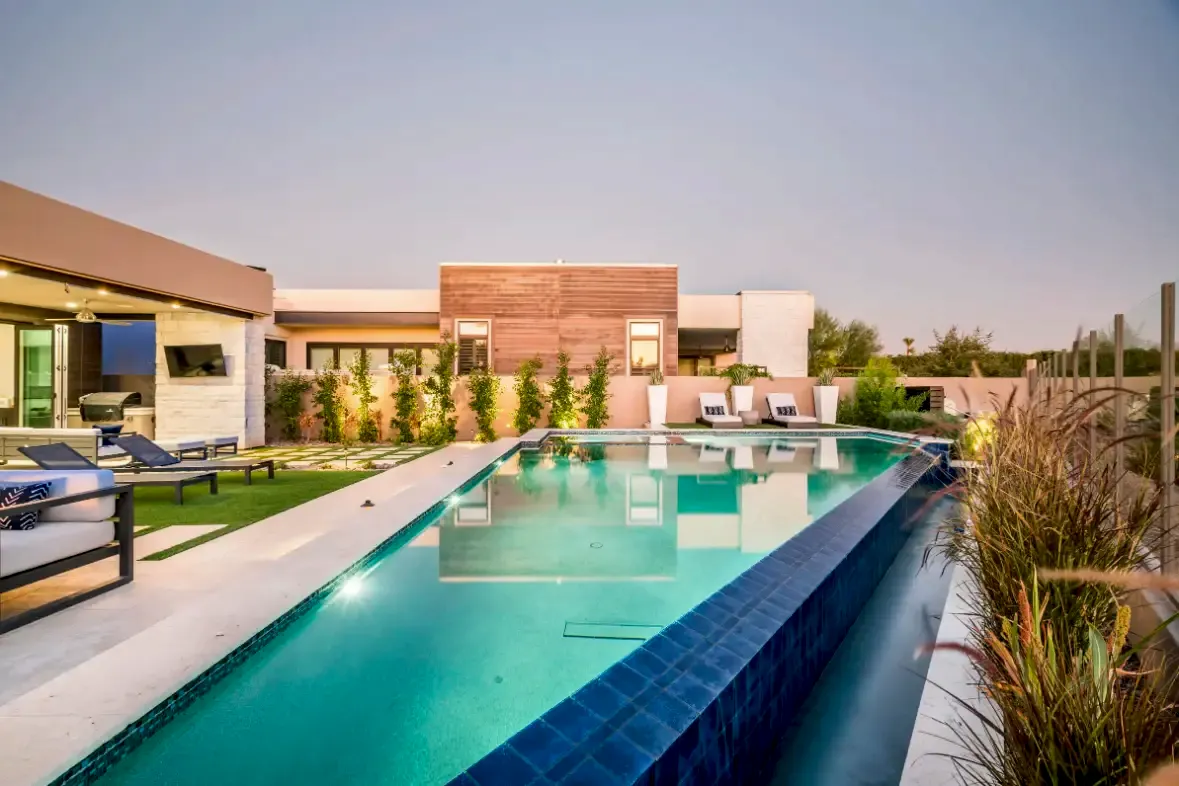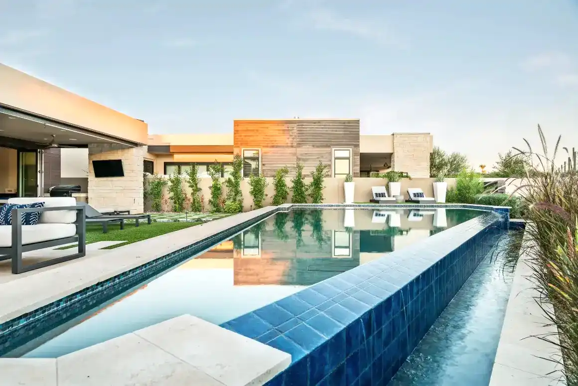 This backyard features a sleek, modern pool with a blue-tiled infinity edge, enclosed by a stylish glass fence that maintains open views. The pool area is surrounded by comfortable lounge seating on a manicured green lawn, creating a perfect blend of relaxation and elegance. Tall planters and a privacy wall with vertical greenery add to the contemporary aesthetic, while large sliding doors connect the pool area seamlessly to the indoor living space, ideal for both leisure and entertaining.